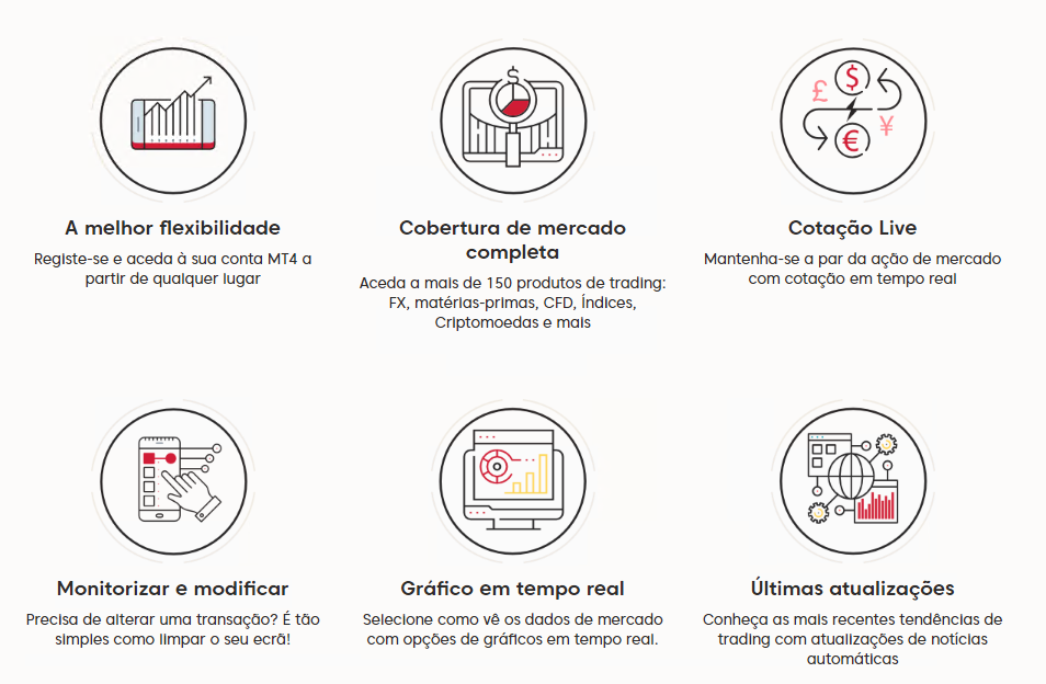 O MetaTrader 4 permite que você opere em quase qualquer dispositivo. É simples de usar e repleto de funções como gráficos, alertas de preços, indicadores personalizados e ferramentas de análise. O aplicativo MT4 é a maneira perfeita de acompanhar o mercado em tempo real, onde quer que você esteja.