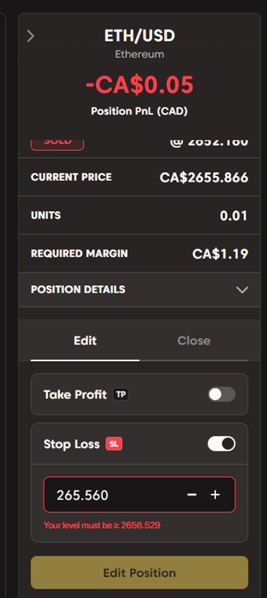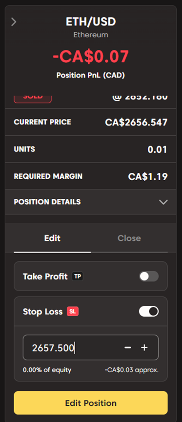 - Painel de Edição de Trade: Alternativamente, clique na linha da trade para abrir o painel lateral de edição de trade, onde você pode visualizar os detalhes da operação e ajustar o stop loss ou take profit. Quando estiver pronto, clique em “Editar Posição.” Se for bem-sucedido, você receberá uma notificação confirmando que sua posição foi modificada.