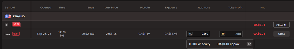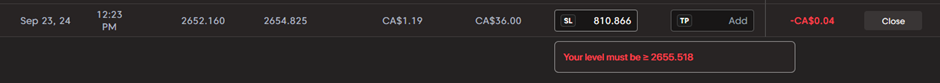 - Edição Em Linha: Você pode ajustar os níveis de stop loss e take profit diretamente clicando nas caixas editáveis na tabela. Quando estiver pronto, clique na seta para aplicar suas alterações. Se for bem-sucedido, você verá uma notificação confirmando que sua posição foi modificada.