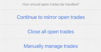 - Se você optar por parar de copiar um sinal, será perguntado como gostaria de gerenciar todas as operações abertas. Depois de decidir, um pop-up confirmará a “Suspensão de cópia”. Clique OK".