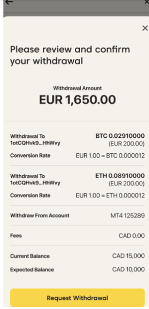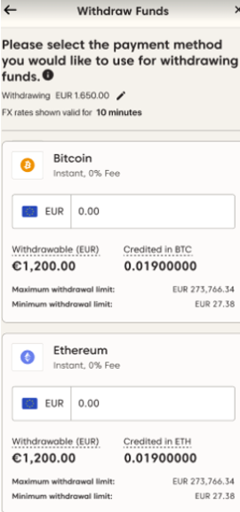 - Escolha a criptomoeda que deseja usar e insira o valor da retirada.