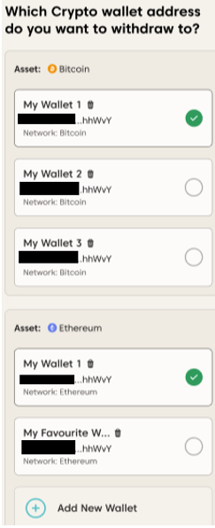 - Selecione o endereço da carteira de criptomoeda para onde deseja enviar os fundos. Se estiver retirando para uma nova carteira, lembre-se de que você pode salvar até 3 carteiras únicas por criptomoeda.