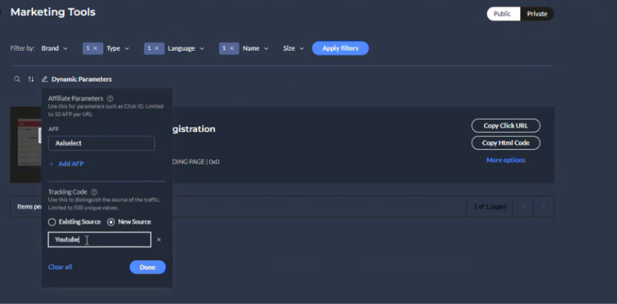 - Copiar URL/Copiar código HTML: Depois de criar o AFP, clique em “Copy” para obter seu link de indicação com o AFP incluído.