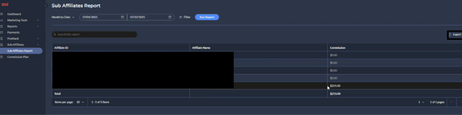 اس ٹیب میں آپ منتخب مدت کے لیے ہر سب افیلیٹ کی کمائی گئی کمیشن دیکھ سکتے ہیں، Sub-Affiliate ID، Level یا Name جیسے فلٹرز سے رپورٹ کو حسبِ ضرورت بنا سکتے ہیں، اور اگر آپ کے سب افیلیٹس موجود ہیں تو اُن کی تفصیلات بھی دیکھ سکتے ہیں۔