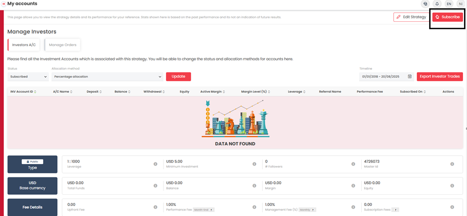 Lưu ý quan trọng: Trong hệ thống PAMM, khách hàng có thể hủy đăng ký chiến lược master bất kỳ lúc nào qua cổng PAMM, và phí hiệu suất sẽ tự động được trừ vào lợi nhuận kiếm được cho đến thời điểm hủy.