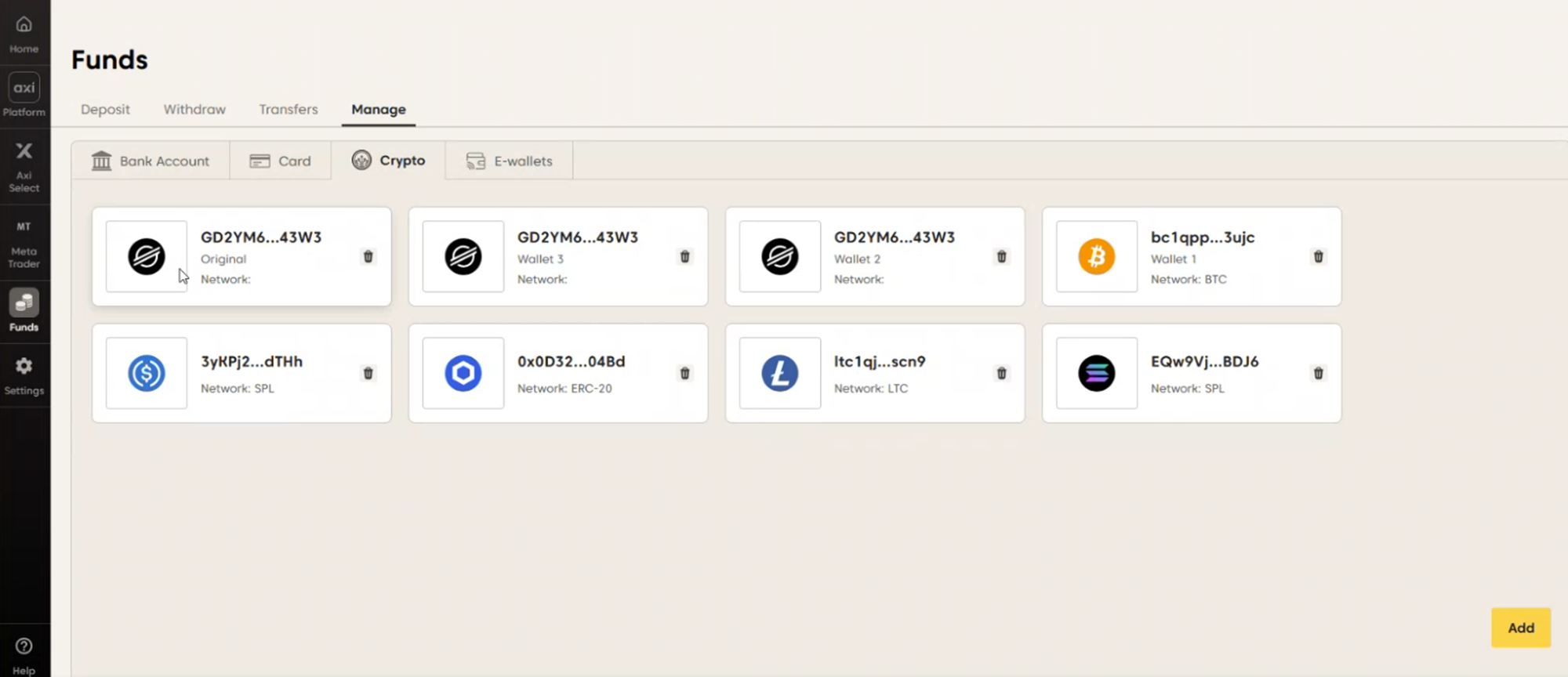 - 在資金部分,選擇管理標籤;這將顯示您所有已保存的付款方式。